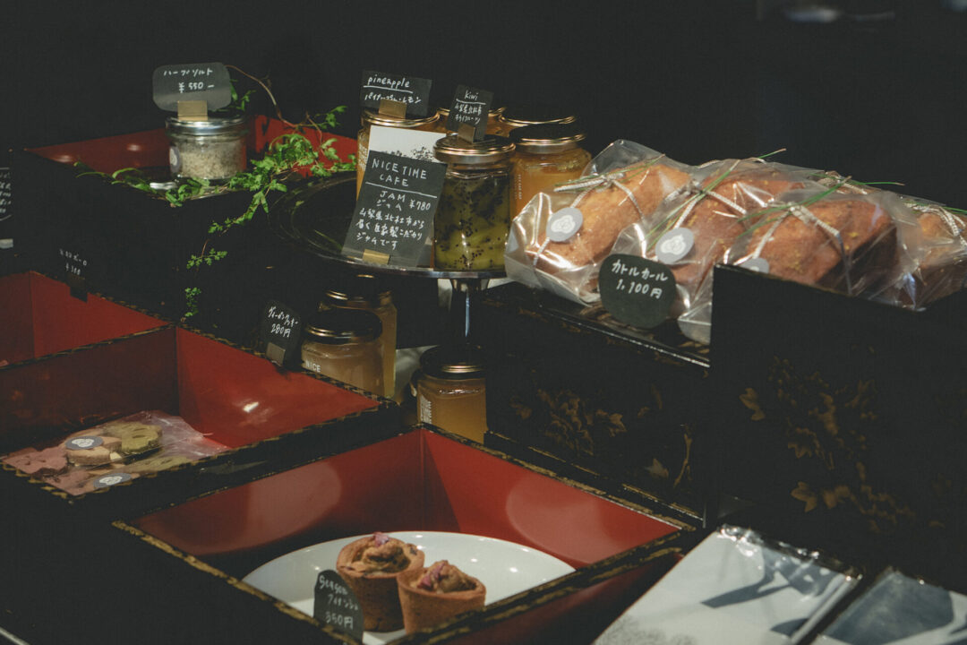 開演前や仲入りではあたたかいほうじ茶の振る舞いに合わせて、まるまつ食堂の焼き菓子が販売されました。この日だけの特別な松竹梅クッキーやフィナンシェなどが並び、お茶と一緒に召し上がったり、手土産に持ち帰られる方もいらっしゃいました。